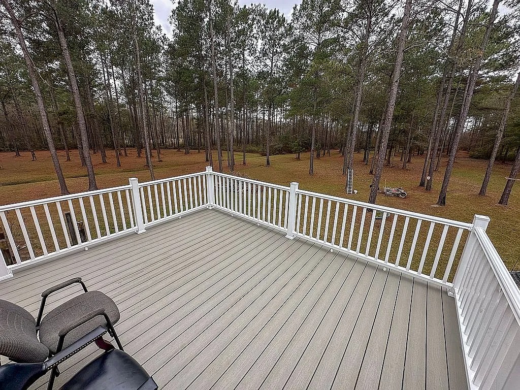 The second floor of the building offers approximately 250 square feet of finished living space, completed in 2024. This area is perfect for sleeping, relaxing, or short stays, while the remaining upper level provides generous storage or future finishing potential. Outside, an oversized Trex deck, also completed in 2024, overlooks the wooded acreage, creating a natural setting for mornings, evenings, or wildlife observation. The combination of indoor and outdoor spaces enhances daily use and recreational enjoyment.