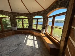 Designed with quality and comfort in mind, the home features large picture windows that fill the interior with natural light while framing sweeping views of the lake and surrounding landscape. The open living and dining areas create a welcoming environment for both everyday living and entertaining, while a wood-burning fireplace adds charm and warmth during cooler months.